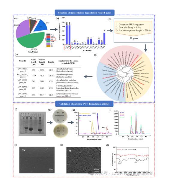 圖1.黃粉蟲腸道微生物群中PET降解酶的生物信息學(xué)篩選。黃粉蟲幼蟲。(a)黃粉蟲腸道微生物宏基因組中碳水化合物活性酶(CAZymes)主要類別的比例;(b)CE家族的相對豐度;(c)候選酶的篩選標(biāo)準;(d)22個基因和已知木質(zhì)纖維素降解酶的系統(tǒng)發(fā)育樹;(e)5個選定候選酶的生物信息;(f)蛋白SDS-PAEG凝膠電泳圖;(g)在三丁酸甘油酯瓊脂板上酶周圍形成的水解圈;(h,i)PET降解產(chǎn)物MHET和TPA的HPLC色譜圖;(j,k)未處理(CK)和酶55處理PET薄膜的SEM圖;(l)未處理和酶55處理PET薄膜的FT-IR光譜圖。