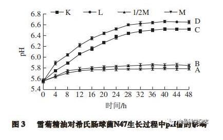 3、雪菊精油對(duì)希氏腸球菌N47生長(zhǎng)過程中pH值的影響