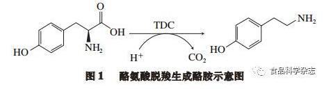 酪胺是以酪氨酸為前體物質(zhì)經(jīng)脫羧后形成的一種血管活性生物胺(圖1),廣泛存在于奶酪、豆制品和發(fā)酵肉制品等食品中。當(dāng)體內(nèi)酪胺含量過高或分解代謝受阻時(shí),過量的酪胺進(jìn)入血液,刺激交感神經(jīng)系統(tǒng)興奮,過度釋放去甲腎上腺素,使大腦和心臟處于高壓狀態(tài)從而引發(fā)一系列的生理反應(yīng),包括頭痛、偏頭痛、發(fā)熱、心悸、流涎、流淚等。