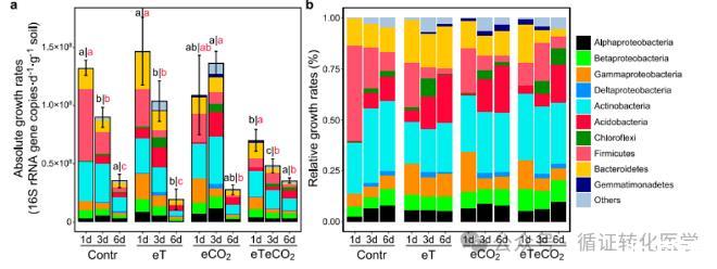 具有相對較高增長率的群系屬于幾個細(xì)菌門(圖2),包括放線菌門(平均相對增長率:新的16S rRNA基因拷貝的29%),厚壁菌門,擬桿菌門,酸桿菌門和γ-變形菌綱(分別為14%,13%,11%,和9%)。一些門在不同氣候變化情景中具有相似的增長動態(tài)(即,沿著培養(yǎng)時間的增長率變化)。例如,在所有氣候變化情景中,γ-變形菌綱,擬桿菌門和放線菌門的增長率在第一天達(dá)到峰值,而δ-變形菌綱和綠彎菌門在第三天達(dá)到峰值。一致的增長軌跡表明這些門類在未來的氣候變化中可能具有穩(wěn)健且可預(yù)測的增長響應(yīng)。相比之下,酸桿菌門和厚壁菌門等幾個門的最大增長率出現(xiàn)的時間點依賴于氣候情景,表明直接氣候敏感性或間接地由于植物根際沉積物的變化所致。