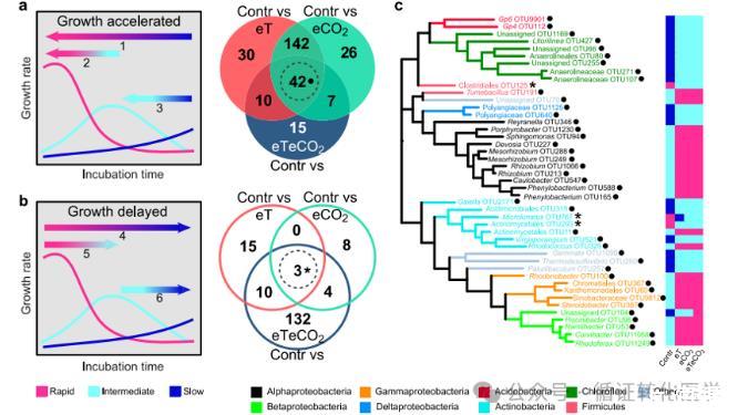 在生長策略發(fā)生變化的群系中,共有45個OTUs在三種處理比較中共享(即,對照vs eT,對照vs eCO2,對照vs eTeCO2),其中包括42個“生長加速”的OTUs和3個“生長延遲”的OTUs(圖4a,b)。基于這些OTUs的可視化的系統(tǒng)發(fā)育分布(圖4c),42個一致“生長加速”的OTUs顯示了一個廣泛分布于八個主要門的情況。大多數(shù)與α-變形菌門、β-變形菌門和γ-變形菌門相關(guān)的OTUs將其策略從“中間”轉(zhuǎn)變?yōu)椤翱焖佟薄T谶m應(yīng)氣候變化后,與δ-變形菌門、放線菌門、綠彎菌門和酸桿菌門相關(guān)的OTUs主要將其策略從“慢速”轉(zhuǎn)變?yōu)椤爸虚g”響應(yīng)??偟膩碚f,適應(yīng)氣候變化通過物種組成及其響應(yīng)策略的轉(zhuǎn)變重塑了微生物生長模式,最終影響了系統(tǒng)發(fā)育模式。