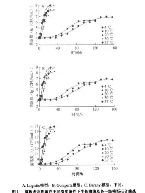 圖1腐敗希瓦氏菌在不同溫度條件下生長曲線及各一級模型擬合曲線