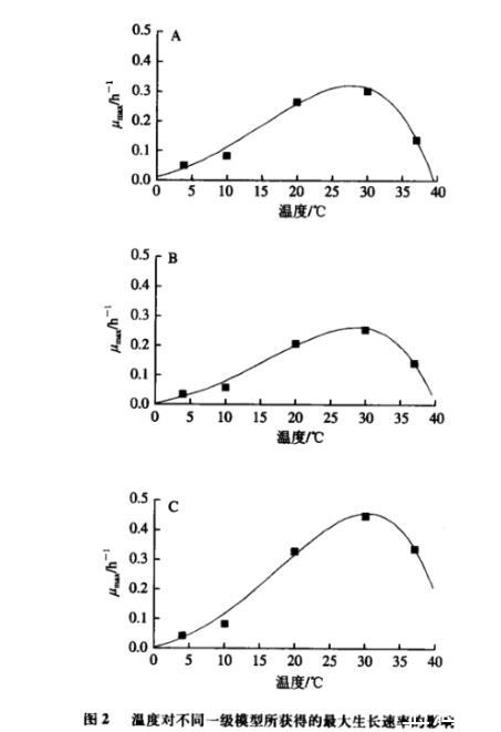 圖2溫度對不同一級模型所獲得的最大生長速率的影響