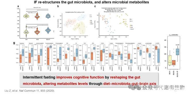 從圖a、b、c中可以看出間歇性飲食改變了菌群豐度和腸道菌群的多樣性,圖g表明間歇性飲食極大程度改變了各腸道菌群代謝物。以上研究結(jié)果證明IF可以通過重組腸道微生物群,改變微生物代謝物水平,通過微生物-代謝物-腦軸改善認(rèn)知功能障礙。