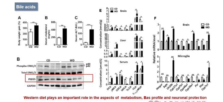 膽汁酸(Bile acids,BAs)是膽汁的重要成分,在脂肪代謝中起著重要作用。除了消化功能外,膽汁酸還作為從腸道內(nèi)進(jìn)入大腦的有效信號(hào)分子,通過激活FXR受體和質(zhì)膜TGR5受體,影響全身脂質(zhì)、膽固醇和葡萄糖代謝,以及能量和免疫穩(wěn)態(tài)。有研究顯示,西方飲食WD增加小鼠體重、血清膽固醇、血清ALT水平,提示肝損傷(圖C)。長(zhǎng)期攝入WD激活了ERK1/2,并降低了大腦中的突觸后密度-95蛋白(Postsynaptic density protein-95,PSD95),提示突觸后損傷。此外,WD攝入導(dǎo)致腦、肝、血內(nèi)BAs譜的改變(圖E),mRNA水平顯示Fxr表達(dá)減少(圖F)。