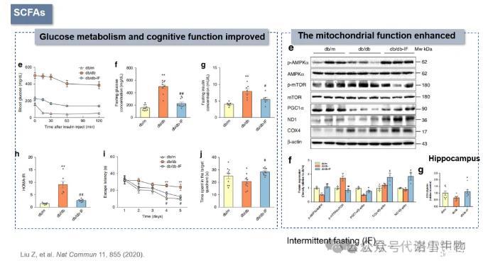 腸道菌群代謝物,特別是SCFAs(主要是乙酸鹽、丙酸鹽和丁酸鹽)占腸道菌群代謝物的95%以上。許多研究證明,SCFAs在腸腦軸中的作用被廣泛研究。認(rèn)知能力下降是2型糖尿?。═ype 2 diabetes,T2D)的并發(fā)癥之一。間歇性禁食(Intermittentfasting,IF)是一種有希望緩解T2D癥狀的飲食干預(yù)。有研究用28天的糖尿病間歇性飲食小鼠模型進(jìn)行探究,發(fā)現(xiàn)間歇性飲食可以降低小鼠的血糖,改善胰島素抵抗(圖e-h),從i、j圖可以看出認(rèn)知功能的改善。右圖能量代謝相關(guān)通路蛋白表達(dá)增加,表明間歇性飲食能增強(qiáng)小鼠能量代謝和線粒體功能。