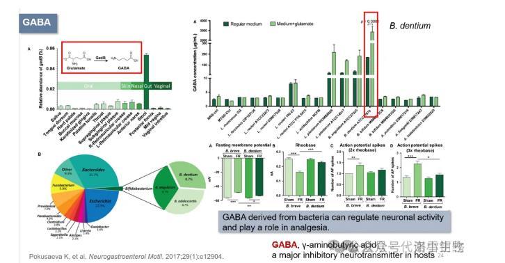 人類和細(xì)菌都具有將谷氨酸轉(zhuǎn)化為GABA的能力,這是宿主體內(nèi)主要的抑制性神經(jīng)遞質(zhì),大腸桿菌和乳酸桿菌等都能夠產(chǎn)生GABA。GadB是一種能產(chǎn)生GABA的主要細(xì)菌酶(谷氨酸脫羧酶),A圖宏基因組數(shù)據(jù)表明在96個(gè)健康成人個(gè)體的不同身體部位發(fā)現(xiàn)的微生物基因組中g(shù)adB的相對(duì)豐度,發(fā)現(xiàn)在糞便中含量最高,B圖估計(jì)了健康人類腸道微生物組成員中谷氨酸脫羧酶的情況,并確定對(duì)雙歧桿菌進(jìn)行進(jìn)一步研究。隨后作者探究了不同細(xì)菌的GABA生成能力,發(fā)現(xiàn)B.dentium最強(qiáng)。后續(xù)研究發(fā)現(xiàn),細(xì)菌來源的GABA能通過調(diào)節(jié)靜息電位和不同基強(qiáng)度下動(dòng)作電位大小來調(diào)節(jié)神經(jīng)元活動(dòng),起到鎮(zhèn)痛的作用(圖A-D)。