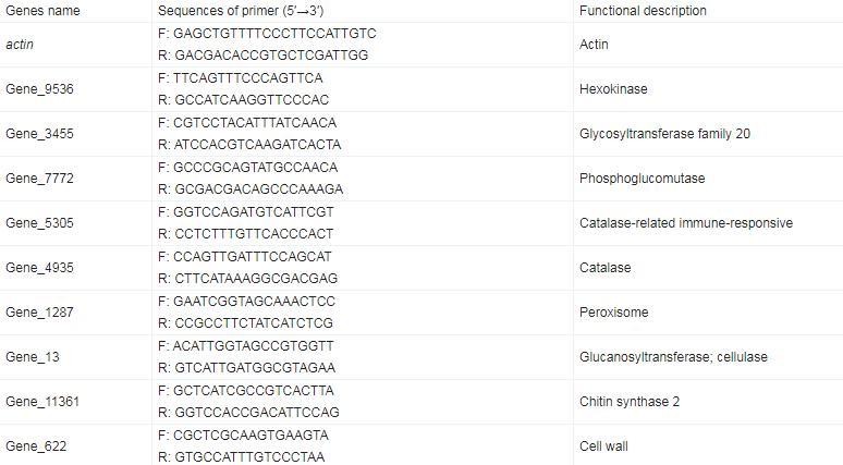 根據(jù)1.6.1、1.6.2和1.6.3實(shí)驗(yàn)結(jié)果,利用實(shí)時熒光定量PCR檢測拮抗菌對S.sclerotiorum PZ-2基因組中糖代謝、抗氧化酶和細(xì)胞壁成分相關(guān)基因表達(dá)情況的影響。