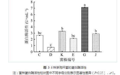 圖3展示了6株芽孢桿菌的蛋白酶活力。液體法的反應(yīng)底物為酪蛋白,通過比較蛋白酶活性數(shù)值可以初步判斷6株菌的蛋白腐敗能力。解淀粉芽孢桿菌(G)表現(xiàn)出的活力最強(qiáng),為7.17 U/mL,沙福芽孢桿菌(D)的蛋白酶活相比于其他菌較低,為0.75 U/mL,其余4株菌的蛋白酶活在2.16~3.32 U/mL之間。根據(jù)試驗結(jié)果可以初步判定解淀粉芽孢桿菌(G)的蛋白腐敗能力最強(qiáng)。然而,液體法只能反映出6株芽孢桿菌對酪蛋白的分解能力。因此,在蛋白酶試驗中,需要綜合液體法和平板培養(yǎng)的結(jié)果,以判斷不同菌株之間蛋白酶活力的差異。