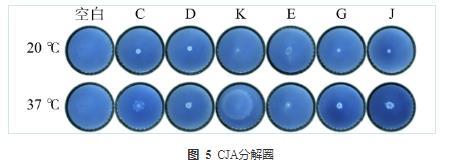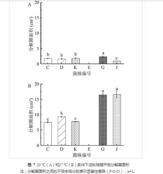圖7展示了在20℃和37℃條件下培養(yǎng)5 d后,6株芽孢桿菌產(chǎn)生的最大分解圈面積數(shù)據(jù)。芽孢桿菌作為傳統(tǒng)發(fā)酵食品中常見的優(yōu)勢微生物,常見于各種淀粉含量高的食品。SHEN等的研究證明芽孢桿菌具有較強(qiáng)的淀粉分解能力。在本試驗的6株芽孢桿菌中,蠟樣芽孢桿菌(C)、沙福芽孢桿菌(D)、高山芽孢桿菌(K)、解淀粉芽孢桿菌(G)和地衣芽孢桿菌(J)這5株芽孢桿菌展示出了淀粉分解能力。在20℃條件下,解淀粉芽孢桿菌(G)的分解圈面積最大,達(dá)到了2.30 cm2,說明在20℃的環(huán)境溫度下,5株產(chǎn)淀粉酶的菌株中解淀粉芽孢桿菌(G)的淀粉酶活力最強(qiáng);在37℃條件下,解淀粉芽孢桿菌(G)和地衣芽孢桿菌(J)的分解圈面積顯著大于另外3株(P<0.05),解淀粉芽孢桿菌(G)的分解圈面積達(dá)到了16.53 cm2,地衣芽孢桿菌(J)的分解圈面積達(dá)到了16.61 cm2,說明在37℃的環(huán)境溫度下,5株產(chǎn)淀粉酶的菌株中解淀粉芽孢桿菌(G)、地衣芽孢桿菌(J)的淀粉酶活力最強(qiáng)。