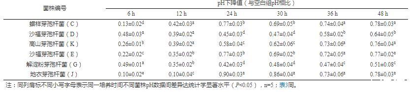 本試驗中以相同條件下空白組與菌株pH的差值體現(xiàn)菌株的產(chǎn)酸能力,表2與表3展示了在不同溫度下6株菌48 h內(nèi)的產(chǎn)酸情況。根據(jù)顯著性分析,在20℃下培養(yǎng)48 h,蠟樣芽孢桿菌(C)、高山芽孢桿菌(K)、沙福芽孢桿菌(E)和地衣芽孢桿菌(J)的pH變化顯著高于其他2株菌(P<0.05),其中蠟樣芽孢桿菌(C)和地衣芽孢桿菌(J)pH較空白組下降0.78;在37℃組中,培養(yǎng)至48 h的蠟樣芽孢桿菌(C)pH下降值仍顯著高于其他5株菌(P<0.05),為0.71。根據(jù)以上分析,蠟樣芽孢桿菌(C)的產(chǎn)酸能力顯著強(qiáng)于其他5株菌。