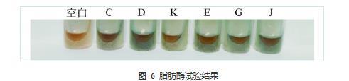 6株菌株在芽孢桿菌較適宜的生長溫度37℃條件下培養(yǎng)48 h后全部呈陽性(圖6),說明6株芽孢桿菌可產(chǎn)脂肪酶,具有脂肪腐敗能力。芽孢桿菌作為一種常見的胞外脂肪酶來源,部分分離株已被證明具有很強(qiáng)的脂肪酶活力,并用于處理食品工業(yè)中富含脂肪的廢棄物。先前的多項研究證明蠟樣芽孢桿菌、地衣芽孢桿菌、解淀粉芽孢桿菌和高山芽孢桿菌具有脂肪酶活力,與本試驗結(jié)論一致。