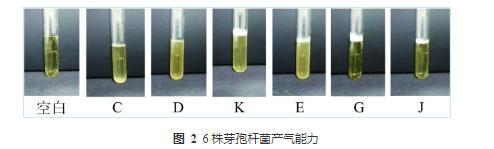 如圖2所示,所有菌株的Durham管內(nèi)均無氣柱產(chǎn)生;同時根據(jù)培養(yǎng)過程的觀察,可以確定6株芽孢桿菌在培養(yǎng)過程中均沒有氣體產(chǎn)生。