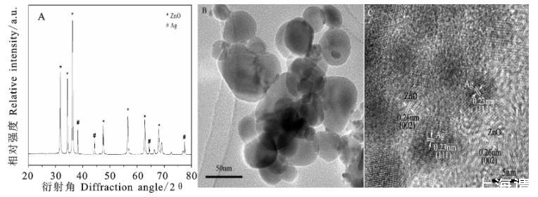 圖1納米ZnO-Ag復合材料的XRD衍射花樣(A)、TEM圖(B)和HRTEM圖(C)