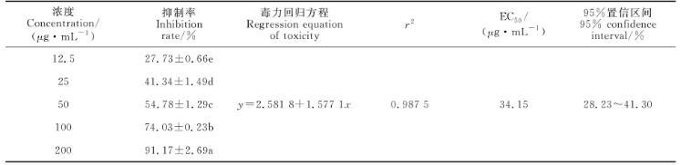由表1可知,納米ZnO-Ag復合材料能夠抑制小麥根腐菌菌絲的生長,菌絲生長抑制率隨材料濃度的升高而增大,200μg·mL-1ZnO-Ag對病菌菌絲生長抑制率高達91.17%;不同濃度復合材料處理的病菌菌絲生長抑制率間差異均顯著(P<0.05)。納米ZnO-Ag對病菌的毒力回歸方程為y=2.581 8+1.577 1x,EC50=34.15μg·mL-1,說明ZnO-Ag復合材料對小麥根腐病菌的抑制作用較強。