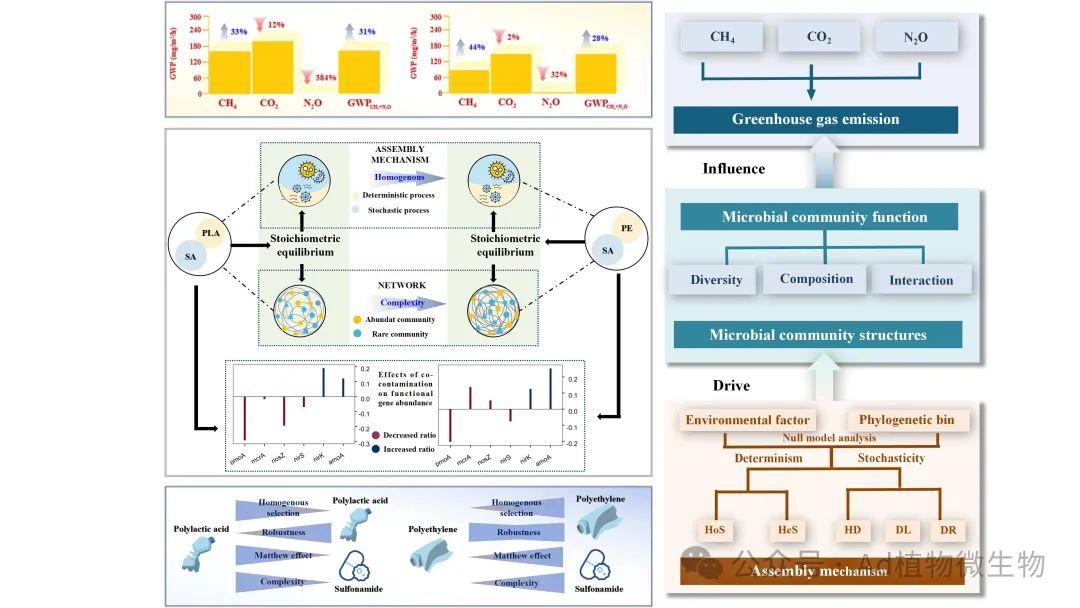 為解決上述問題,中國科學(xué)院東北地理與農(nóng)業(yè)生態(tài)研究所水環(huán)境污染與防治研究團(tuán)隊(duì)通過微宇宙模擬實(shí)驗(yàn),探究了不同微塑料(傳統(tǒng)微塑料聚乙烯(PE)、可生物降解微塑料聚乳酸(PLA))和磺胺類抗生素(SA)在單一暴露以及復(fù)合暴露條件下,對農(nóng)業(yè)溝渠沉積物溫室氣體(CH4、CO2和N2O)排放特征的影響,并初步揭示了其潛在的微生物學(xué)機(jī)制。研究結(jié)果顯示,不同處理下溝渠沉積物全球增溫潛勢值(GWP)依次為:SA+PLA (162.96 mg/m2/h) > PLA (123.49 mg/m2/h) > SA (121.75 mg/m2/h) > SA+PE (102.33 mg/m2/h) > CK (84.67 mg/m2/h) > PE (78.29 mg/m2/h)。