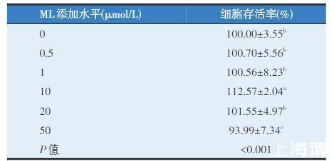 由表5可知,與control組相比,10μmol/L的ML組細胞存活率最高(P<0.05);而50μmol/L的ML組細胞存活率顯著降低(P<0.05)。