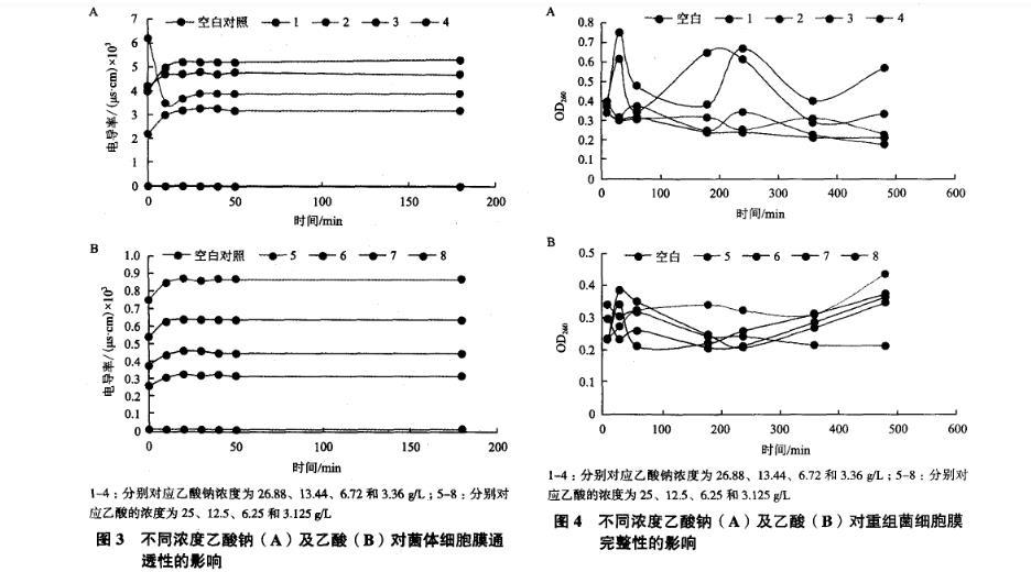 圖3不同濃度乙酸鈉(A)及乙酸(B)對菌體細(xì)胞膜通透性的影響