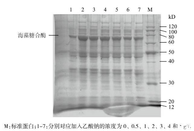 圖8顯示,加入低濃度的乙酸鈉,海藻糖合酶的表達(dá)量會增大,推測是由于乙酸根進(jìn)入胞內(nèi),會作為碳源參與到菌體的代謝中,因而其表達(dá)量增大,但隨著濃度的繼續(xù)增大,乙酸的抑制作用也會表現(xiàn)出來,海藻糖合酶的表達(dá)量則隨著乙酸鈉濃度的增大而減小,說明乙酸鈉會對海藻糖合酶的表達(dá)產(chǎn)生抑制。