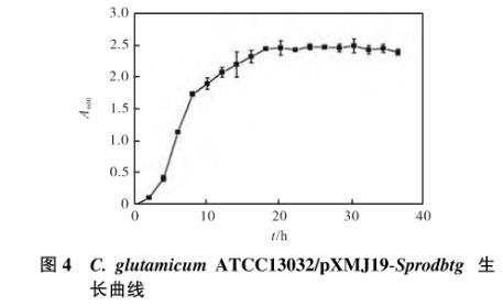 圖4 C.glutamicum ATCC13032/pXMJ19-Sprodbtg生長曲線