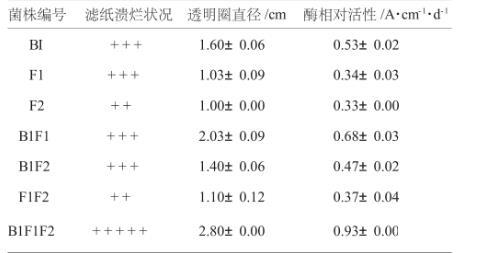 對(duì)7種樣品進(jìn)行系統(tǒng)分離,初篩獲得約20株菌,通過對(duì)菌落形態(tài)、生長(zhǎng)速度的觀察以及分解纖維素能力判定,挑選其中3株用PDA培養(yǎng)基平板進(jìn)行分離純化得到單個(gè)菌株B1、F1、F2。單個(gè)菌株B1、F1、F2以及它們相互混合對(duì)濾紙、羧甲基纖維素分解能力見表2、表3。從表2、表3可以看出:各菌株單獨(dú)培養(yǎng)對(duì)濾紙、羧甲基纖維素均有一定的分解效果,但不如混合的效果好,B1、F1、F2混合培養(yǎng)8d時(shí),濾紙失重率達(dá)到58.06%、酶相對(duì)活性0.93±0.00 cm·d-1,由此說明,3株菌株混合可以增加酶活力,各菌之間有很好的協(xié)同效應(yīng)。