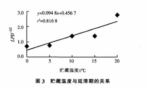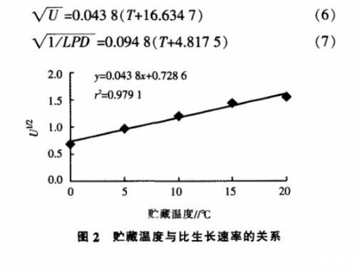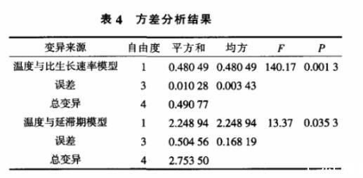 表4是模型的方差分析結果,用F統計量來檢驗平方根模型的顯著性。由圖2、圖3、表4可知,此方程能較好地描述試驗貯藏溫度范圍內溫度與最大比生長速率、貯藏溫度與延滯期的關系。