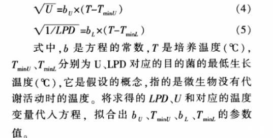 二級模型主要表達初級模型的參數與單個或多個環(huán)境條件(如溫度、pH、水分活度Aw等)變量之間的函數關系。平方根模型因使用簡單方便,參數單一,能夠很好地預測單因素下微生物的生長情況,常被用于描述溫度與微生物特定動力學參數之間的關系。應用平方根方程描述效果簡單有效,方程式如下: