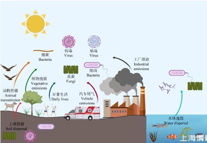 空氣微生物無處不在,多以附著于顆粒物的形式存在,主要包括細菌、真菌、病毒及放線菌等。它們來源廣泛(圖1):自然源包括土壤、淡水和海洋、植物等;人為源包括人體皮膚、唾沫、動物飼養(yǎng)、工業(yè)生產、污水處理以及交通車輛尾氣排放等??諝馕⑸锟啥ㄖ秤谌梭w皮膚、消化道和呼吸道黏膜等,影響人類健康。研究表明,城市空氣微生物多樣性低是造成城市兒童患哮喘率顯著高于農村兒童的重要原因。芬蘭科學家也發(fā)現(xiàn),暴露于多樣性高的空氣微生物中可增強兒童的免疫力??諝馕⑸锬芤灶w粒物等作為載體進行長距離傳播,引發(fā)多點間人和動物的交叉病原微生物感染,造成更多人員疾病。