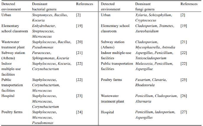 和擬桿菌門(Bacteroides)在空氣細菌群落組成中占主導地位。雖然如此,空氣微生物群落組成仍存在顯著的時空差異,細菌的濃度、多樣性、大小分布和優(yōu)勢種會隨時間和空間的變化而變化。最新研究表明,廈門市細菌絕對豐度在冬季顯著高于夏季,公園的空氣細菌絕對豐度最低,工業(yè)區(qū)的空氣細菌絕對豐度最高。在不同季節(jié)和不同城市化程度區(qū)域,Li等研究發(fā)現(xiàn),空氣微生物中致病細菌也存在明顯差異,病原微生物占總細菌的比例在夏季顯著高于春季,城市化顯著增加了潛在致病性物種的相對豐度,特別是在醫(yī)院附近。此外,Zhai等研究表明,細菌暴露水平主要與人體口腔、室內人體皮膚以及室外風、溫度、相對濕度等多種因素相關,因此,細菌組成與具體環(huán)境密切相關(表1),城市環(huán)境中常檢測到的是鏈霉菌屬(Streptomyces)、微球菌屬(Micrococcus)和考克氏菌屬(Kocuria);在小學教室中占主導地位的優(yōu)勢細菌屬是水棲菌屬(Enhydrobacter)、鏈球菌屬(Streptococcus)和微球菌屬(Micrococcus);污水處理廠中主要是葡萄球菌屬(Staphylococcus)、芽孢桿菌屬(Bacillus)和假單胞菌屬(Pseudomonas);在地鐵站常檢測到副球菌屬(Paracoccus)、鞘氨醇單胞菌屬(Sphingomonas)和考克氏菌屬(Kocuria);在室內多用途設施(公共洗浴設施、商務辦公室、美食廣場)和公共交通設施(機場、火車站)、醫(yī)院和家禽養(yǎng)殖場等空氣中的優(yōu)勢細菌屬只有細微的差別。然而,目前的研究多以單一時間采樣為主,缺乏時間尺度高分辨率的連續(xù)采集及分析,不能更好地了解微生物群落的時序變化,因此,后續(xù)我們應該著重關注高時間分辨率系統(tǒng)性的研究。