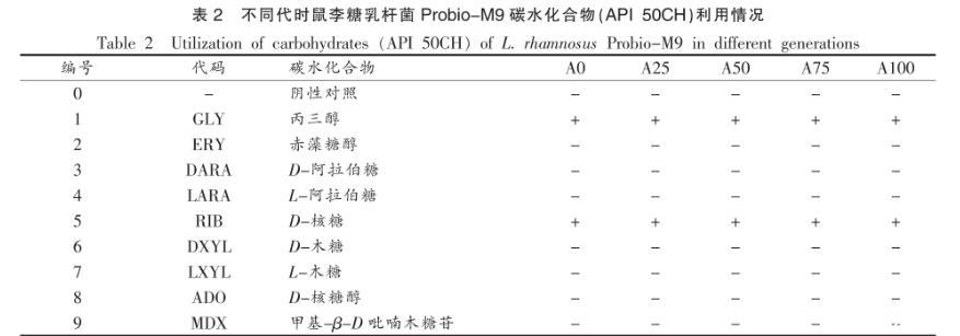 表2不同代時(shí)鼠李糖乳桿菌Probio-M9碳水化合物(API 50CH)利用情況