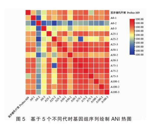 由圖5可知,鼠李糖乳桿菌Probio-M9原始基因組和15株不同代時菌株基因組,兩兩菌株間的ANI值均在99.00%,菌株之間表現(xiàn)出極高的相似性,且高于種間鑒定標準,可準確鑒定為同一亞種,表明連續(xù)培養(yǎng)100代過程中菌株均屬同一亞種即鼠李糖乳桿菌Probio-M9。