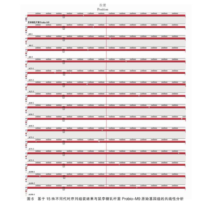 圖6基于15株不同代時序列組裝結果與鼠李糖乳桿菌Probio-M9原始基因組的共線性分析