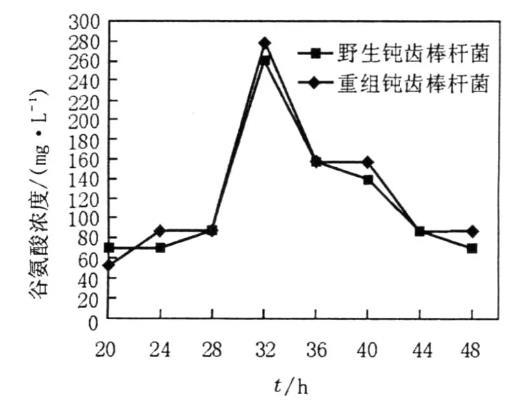 重組鈍齒棒桿菌產(chǎn)生谷氨酸的研究結果表明,重組菌株和野生菌株在實驗發(fā)酵過程中谷氨酸積累量的變化基本趨于一致,表明重組質粒的導入并未影響菌株的代謝產(chǎn)酸量。