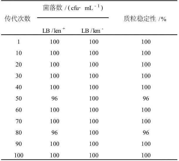 重組鈍齒棒桿菌在無卡那霉素抗性選擇壓力的條件下,在LB固體平板上連續(xù)傳代100次,每隔10代次檢測1次質粒丟失情況。實驗結果表明,重組質粒pJL23-cglⅠ在重組鈍齒棒桿菌中未見明顯丟失現(xiàn)象(見表1)。
