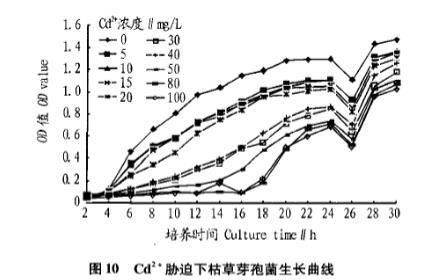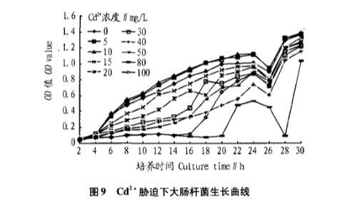 由圖9、10可知,Cd對(duì)微生物生長(zhǎng)的影響比較明顯,cd“濃度為5~10mg/L對(duì)大腸桿菌生長(zhǎng)具有一定促進(jìn)作用,隨著cd“濃度的增加(15~100 mg/L)的cd2+對(duì)大腸桿菌的生長(zhǎng)起到抑制作用,隨著c濃度的增大,抑制作用越明顯;Cd對(duì)枯草芽孢桿菌的生長(zhǎng)始終表現(xiàn)為抑制作用,濃度愈高,抑制作用愈明顯。研究也發(fā)現(xiàn),與G一相比,G對(duì)cd2+更為敏感,曾路生等在水稻生長(zhǎng)、土壤淹水的盆栽條件下,添加外源重金屬,發(fā)現(xiàn)土壤微生物量開(kāi)始隨c濃度增加而上升,達(dá)到一定濃度時(shí)則下降;Shweta等在土壤中加入微量的鎘,能使土壤細(xì)菌數(shù)目由1g土壤含有4 800X10個(gè)減少為2000個(gè)16J。Pvancholy等研究發(fā)現(xiàn),高濃度Cd2+的可減少土壤中細(xì)菌的數(shù)量。說(shuō)明C(I2對(duì)細(xì)菌的生長(zhǎng)存在較大影響,其毒性也較強(qiáng),該試驗(yàn)結(jié)果與其結(jié)論相同。