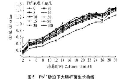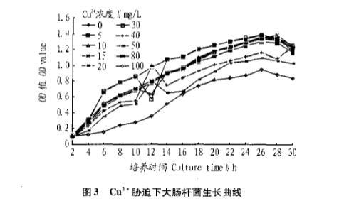 由圖3可知,cu2+往濃度5~15 mg/L時(shí)對(duì)大腸桿菌的生長(zhǎng)無(wú)明顯影響,cu濃度為2O~30m L對(duì)大腸桿菌的生長(zhǎng)具有一定的促進(jìn)作用,cu2+濃度為40~100mg/L時(shí),表現(xiàn)出對(duì)大腸桿菌生長(zhǎng)的抑制作用(80mg/L時(shí)例外,可能是測(cè)量誤差所致),Cu濃度為100m#L時(shí)抑制作用最明顯。由4可知,cu濃度為5、15、20mg/I對(duì)枯草芽孢桿菌的生長(zhǎng)具有一定促進(jìn)作用,cu濃度從30~100mg/L對(duì)枯草芽孢桿菌的生長(zhǎng)的抑制作用逐漸增強(qiáng),但隨著培養(yǎng)時(shí)間的延長(zhǎng),2種細(xì)菌仍有生長(zhǎng),兇此cu對(duì)2種細(xì)菌的毒性沒(méi)有Hg2對(duì)2種細(xì)菌的毒性強(qiáng),在銅對(duì)土壤微生物毒性的研究中表明,低濃度銅對(duì)土壤微生物生物量有顯著刺激作用,高濃度時(shí)則有抑制作用,與該試驗(yàn)結(jié)果基本相似。