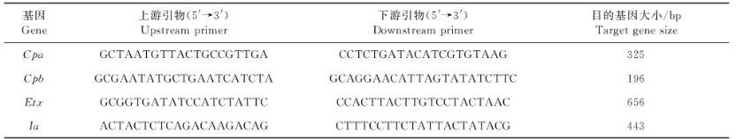 合成產(chǎn)氣莢膜梭菌分型引物(表1)。多重分型PCR體系(50μL):上、下游引物(共4對)各1μL,2×TaqMix酶25μL,模板2μL,去離子水15μL;PCR反應(yīng)程序:94℃預(yù)變性5 min;94℃變性30 s,53℃退火30 s,72℃延伸30 s,共30個(gè)循環(huán);72℃終延伸5 min。PCR產(chǎn)物經(jīng)1%的瓊脂糖凝膠電泳鑒定。