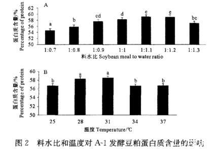圖2料水比和溫度對A-1發(fā)酵豆粕蛋白質含量的影響