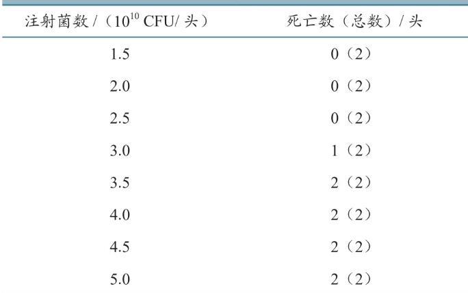 1986、1996、2006、2015年4個凍干代次的CVCC43005株菌種按照最小致死劑量攻擊豬,均可使豬全部死亡,毒力檢定結(jié)果(表4)均符合要求。根據(jù)不同凍干代次CVCC43005株菌種毒力檢定結(jié)果,CVCC43005株菌種毒力檢定標準為取56~63日齡健康易感豬2頭,經(jīng)靜脈注射菌液5.0 mL/頭(活菌濃度不高于7.0×109CFU/mL),觀察4 d,應全部死亡;取18~22 g小白鼠5只,經(jīng)皮下注射菌液0.2 mL/只(活菌濃度不高于50 CFU/mL),觀察7 d,應全部死亡。