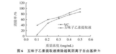由圖5可知,在0.1~0.5mg/mL的質(zhì)量濃度范圍內(nèi),二者對羥自由基清除作用較好,并且其清除效果都與其質(zhì)量濃度有一定的關(guān)系,隨質(zhì)量濃度的增加,對自由基的清除效果增強(qiáng)。另外,總體上五味子乙素提取液對羥自由基清除作用大于VC,其半數(shù)清除質(zhì)量濃度為0.2mg/mL,當(dāng)質(zhì)量濃度為0.5mg/mL,其清除率接近100%,而抗壞血酸的半數(shù)清除質(zhì)量濃度為0.26mg/mL。
