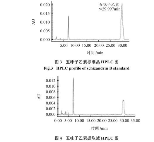 圖1為將HPLC純化后五味子乙素提取液經(jīng)凍干后的五味子乙素的紅外光譜圖,樣品在2959cm-1處有吸收峰,為—CH2伸縮振動(dòng)峰,說明乙素結(jié)構(gòu)中有烷基的存在。樣品在1619cm-1左右處有吸收峰,為芳環(huán)骨架振動(dòng)引起的很強(qiáng)的吸收峰,說明了乙素結(jié)構(gòu)中有苯環(huán)的存在。樣品在1418cm-1左右處有吸收峰,為羧基的C=O的伸縮振動(dòng)峰,說明了乙素結(jié)構(gòu)中有羧基的存在。樣品在1329cm-1處有吸收峰,為羧基的C=O的對稱伸縮振動(dòng)峰,說明了乙素有羧基的存在。樣品在1046cm-1處有吸收峰,為—OH的變角振動(dòng)峰,說明了乙素結(jié)構(gòu)中有羥基的存在。鑒定后的基團(tuán)與圖2中五味子乙素結(jié)構(gòu)符合,基本判定樣品為五味子乙素。圖4為五味子乙素提取液的HPLC圖與圖3五味子乙素標(biāo)準(zhǔn)品的HPLC對照,根據(jù)五味子乙素成分的峰面積的百分比得出其純度(純度≥98%)。