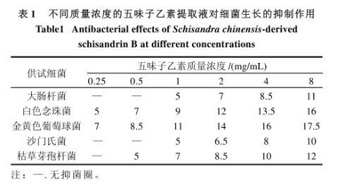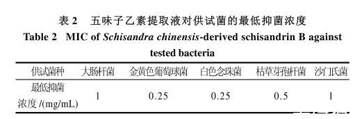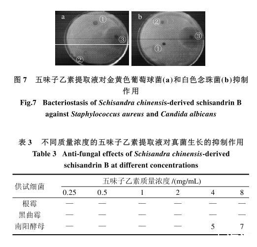 3.2五味子乙素提取液對金黃色葡萄球菌、白色念珠菌、沙門氏菌、大腸桿菌、枯草芽孢桿菌均有一定的抑制作用,其中對白色念珠菌和金黃色葡萄球菌的抑制作用最強(qiáng),最低抑菌濃度為0.25mg/mL,對根霉、黑曲霉、南陽酵母無明顯抑菌活性。