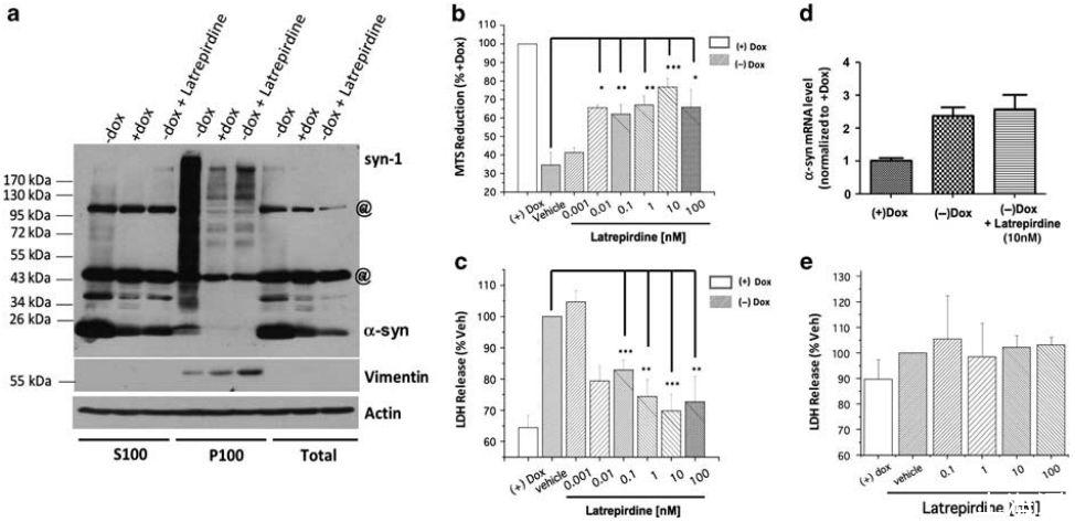 圖3、latrepirdine能刺激α-synuclein(α-syn)的分解,并保護(hù)分化的SHSY5Y神經(jīng)元免受與α-syn相關(guān)的細(xì)胞毒性。使用視黃酸分化穩(wěn)定表達(dá)誘導(dǎo)性('tet-off')人α-syn的SH-SY5Y細(xì)胞(不含多西林(dox)),并在沒(méi)有(空白;不含dox)或有l(wèi)atrepirdine(不含dox)的情況下處理14天。(a)在10nM latrepirdine存在下處理14天的細(xì)胞被裂解,通過(guò)超速離心獲得Triton X-100可溶(S100,左)和不溶(P100,中)顆粒(' '為非特異性條帶)。用latrepirdine處理可減少Triton X-100可溶部分(單體減少=52.7%;s.e.m.=10.38;P<0.01)、總部分(單體減少=68.0%;s.e.m.=15.64;P<0.01)和不溶部分(聚集減少=74.8%;s.e.m.=9.397;P<0.001)中所有形式α-syn的水平,包括聚集體和可溶性單體。(b)對(duì)釋放到培養(yǎng)液中的乳酸脫氫酶(LDH)進(jìn)行定量;或(c)測(cè)量SH-SY5Y細(xì)胞中四氮唑MTS的還原度,以確定在沒(méi)有或存在一系列濃度的latrepirdine(如所示)的情況下細(xì)胞的存活率。(d)使用定量反轉(zhuǎn)錄酶-PCR分析α-syn mRNA水平,并與a-tubulin mRNA水平歸一化。(e)在無(wú)dox的情況下,將過(guò)表達(dá)β-半乳糖苷酶(β-gal)的誘導(dǎo)型SH-SY5Y細(xì)胞培養(yǎng)在96孔板中,24小時(shí)后用視黃酸(RA)和不同濃度的latrepirdine(如所示)處理,并量化培養(yǎng)液中LDH的釋放。