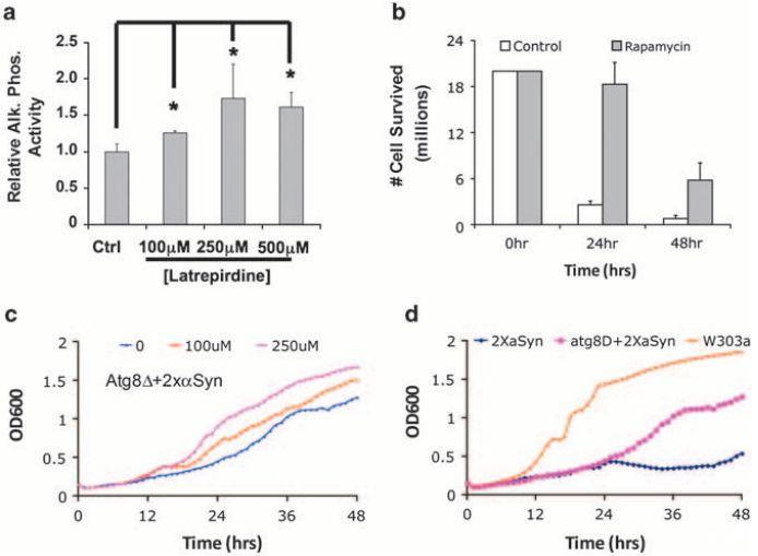 圖2、latrepirdine或雷帕霉素通過(guò)誘導(dǎo)自噬保護(hù)細(xì)胞免受與α-突觸核蛋白(α-syn)相關(guān)的細(xì)胞毒性。(a)在YTS158株系中,自噬體的成熟導(dǎo)致功能性堿性磷酸酶的激活。在合成培養(yǎng)基中生長(zhǎng)至對(duì)數(shù)期后,在沒(méi)有或存在指定濃度的拉曲霉素(如所示)的情況下,測(cè)量YTS158染色體的堿性磷酸酶活性。(b)2xαSyn菌株在YPG半乳糖培養(yǎng)基(α-syn處于“開(kāi)啟”狀態(tài))中生長(zhǎng),雷帕霉素存在或缺失(濃度如所示)。(c)Atg8Δ+2XαSyn培養(yǎng)物在YPGalactose培養(yǎng)基(α-syn處于“開(kāi)啟”狀態(tài))中,在沒(méi)有或有不同濃度的雷帕霉素(濃度如所示)的情況下生長(zhǎng),并通過(guò)測(cè)量OD600監(jiān)測(cè)生長(zhǎng)情況。(d)將2XαSyn、其同源野生型(W303α)和ATG8基因缺失的2XαSyn(Atg8Δ+2XαSyn)置于YPG半乳糖培養(yǎng)基(α-syn處于“開(kāi)啟”狀態(tài))中,在30℃下振蕩培養(yǎng)。使用Bioscreen儀器,每隔1小時(shí)用OD600監(jiān)測(cè)細(xì)胞的生長(zhǎng)情況。