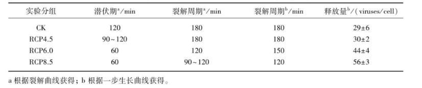 隨著RCP等級(jí)的提高,噬藻體PP的潛伏期和裂解周期均明顯縮短,釋放量則顯著增加(表1):潛伏期從120 min逐步縮短至60 min(縮短了60 min),相應(yīng)的裂解周期也從180 min縮短至120 min(也縮短了60 min),說明裂解周期的縮短主要是由于潛伏期的縮短所造成的;同時(shí),RCP8.5的釋放量比其它3組增加了27%~93%(P<0.01),RCP6.0的釋放量也比RCP4.5和CK組分別增加了47%和52%(P<0.05),但RCP4.5和CK組之間無顯著差異(P>0.05)。此外,表1中采用兩種方法測(cè)得的裂解周期的總體變化趨勢(shì)一致(即裂解周期隨PCPs等級(jí)提高而縮短),但裂解曲線法測(cè)得的裂解周期和一步生長曲線法測(cè)得的裂解周期存在0~30 min的差異,考慮到本研究的取樣間隔為30 min,故將來有必要通過更精細(xì)的測(cè)量(如將取樣間隔設(shè)為5~10 min)來確認(rèn)此差異是否具有統(tǒng)計(jì)學(xué)意義。