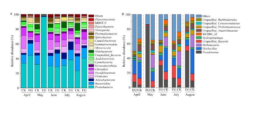 在門水平下,將試驗田CK和EG在4?8月相對豐度排名前20的土壤細菌繪制柱形圖(圖6A)。細菌群落主要由變形菌門(Proteobacteria,96.64%?23.19%)、擬桿菌門(Bacteroidetes,19.85%?0.35%)、脫硫桿菌門(Desulfobacterota,17.48%?0.01%)、放線菌門(Actinomycetota,10.99%?0.79%)、綠屈撓菌門(Chloroflexi,10.84%?0.21%)、厚壁菌門(Firmicutes,8.75%?0.65%)、出芽單胞菌門(Gemmatimonadota,7.17%?0.81%)、酸桿菌門(Acidobacteria,5.02%?0.32%)、藍菌門(Cyanobacteria,4.35%?0.01%)和疣微菌門(Verrucomicrobiota,3.49%?0.02%)、等構成。其中最優(yōu)勢菌門為變形菌門,較優(yōu)勢菌門為擬桿菌門和脫硫桿菌門。