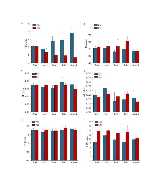 圖3不同月份CK和EG組土壤6種理化指標的變化特征