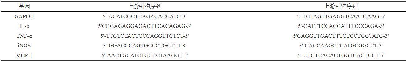 收集對數(shù)生長期的RAW264.7細(xì)胞,鋪板密度為1.0×105個(gè)細(xì)胞/孔,接種于六孔培養(yǎng)板內(nèi),設(shè)置空白對照組、陽性對照組(濃度為1μg·mL?1的LPS)、人參外泌體給藥組(5、10、20μg·mL?1),培養(yǎng)24 h,棄去原有培養(yǎng)基,按照分組給藥,培養(yǎng)24 h后收集細(xì)胞,用Trizol提取總mRNA,根據(jù)反轉(zhuǎn)錄試劑盒說明合成cDNA。使用實(shí)時(shí)定量PCR檢測IL-6、iNOS、TNF-α、MCP-1轉(zhuǎn)錄水平的含量。實(shí)時(shí)定量PCR擴(kuò)增反應(yīng)條件是94℃,30 min,1個(gè)循環(huán);94℃,30 s,55℃,30 s,40個(gè)循環(huán);95℃,1 min,72℃,10 min,1個(gè)循環(huán),PCR引物序列如表1。