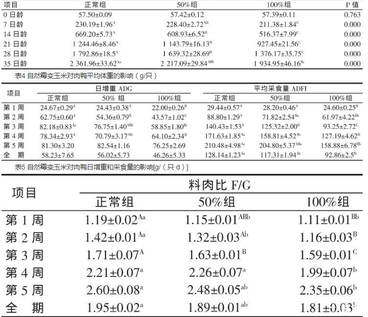 2.1自然霉變玉米對肉鴨生長性能的影響(見表4、表5、表6)