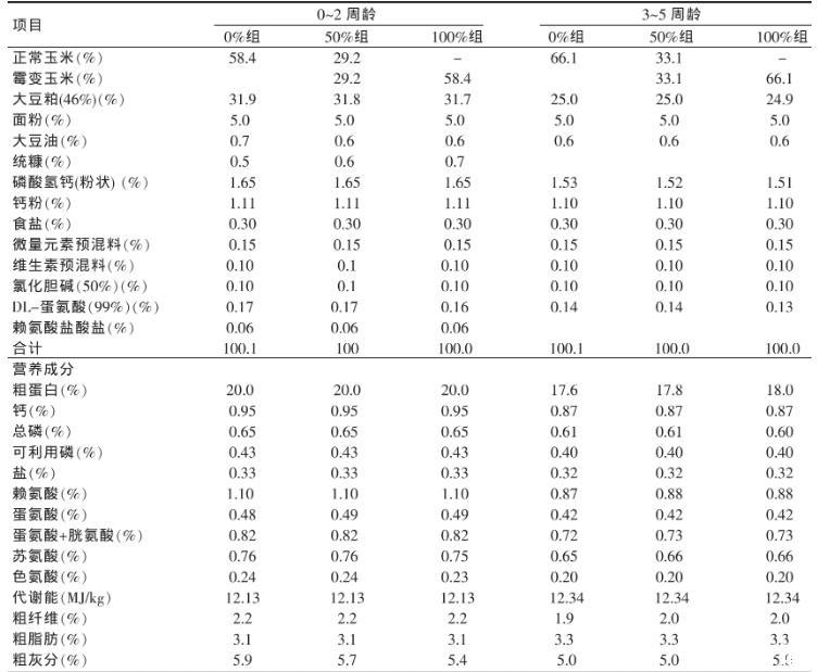 試驗(yàn)日糧配制所用霉變玉米為天然污染多種霉菌的玉米,采用ELISA方法(Neogen公司生產(chǎn)的試劑盒,BIO-RAD公司Model 680型酶標(biāo)儀)對霉變玉米和正常玉米進(jìn)行霉菌毒素分析,見表2。日糧參照按NRC(1994)標(biāo)準(zhǔn),配制0~2周齡小鴨料和3~5周齡的生長鴨料。各日糧中CP、Ca、Tp、EE、Lys、Met+Cys、Thr及Trp的含量基本一致。試驗(yàn)日糧的飼料組成和營養(yǎng)水平見表3。